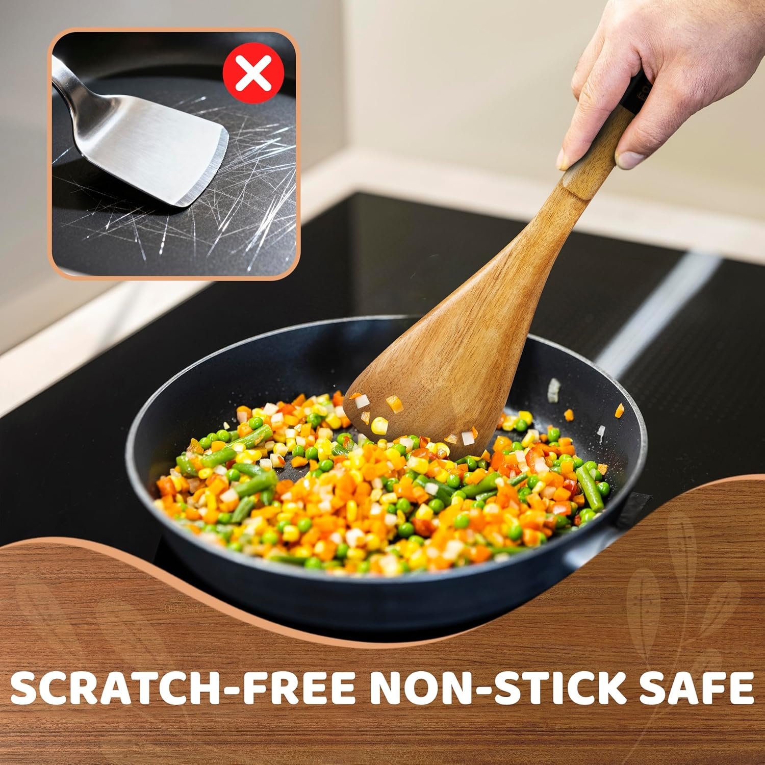 Our wooden cooking utensils set is designed to make cooking a pleasure and safe. With its innovative ergonomic design, each wooden utensil is crafted with an ergonomic handle that guides finger placement, ensuring a comfortable, secure grip and reducing hand fatigue during extended use.