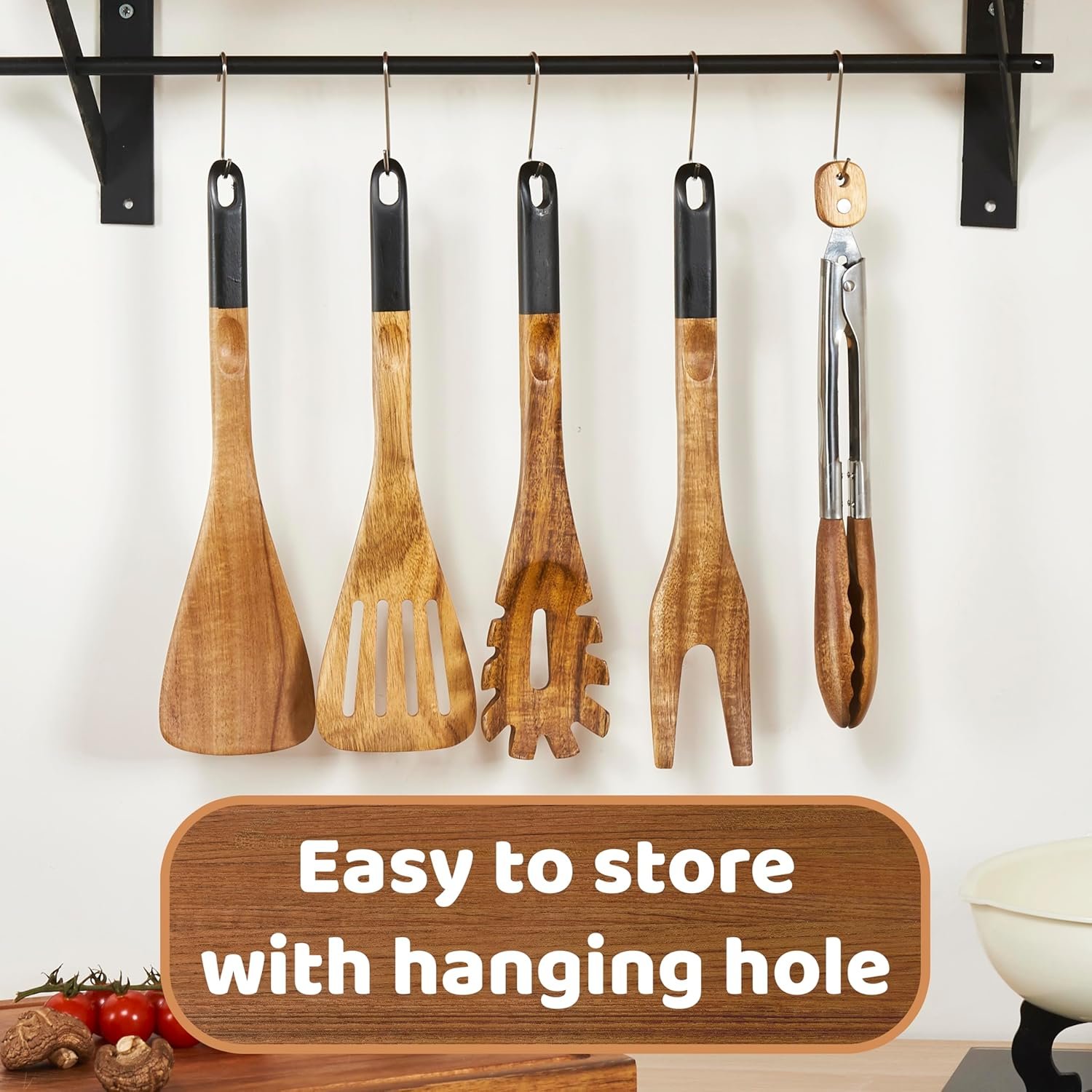 Enjoy the convenience of a 5-piece set featuring 4 premium wooden spoons for cooking and 1 versatile stainless steel kitchen tongs for cooking with wooden tips—perfect for all your cooking, stirring, BBQ and serving needs.