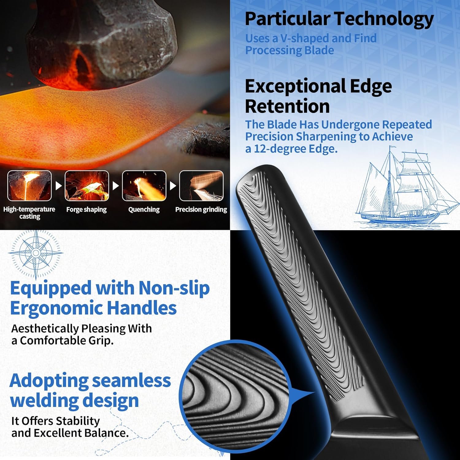 The blade of this kitchen knife is made of high-quality stainless steel, using a V-shaped and fine processing blade, which can maintain the sharpness of the chef knife for a long time with incredible robustness and quality.