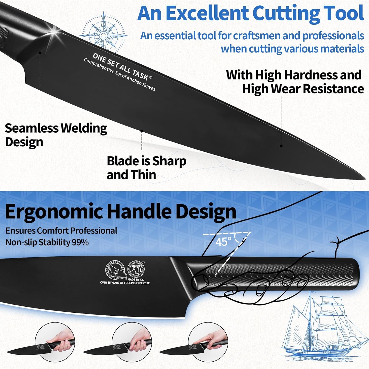 XYJ Stainless steel chef knife is a multipurpose cutlery knife, designed for professional applications, suitable for cutting, dicing, slicing, chopping with vegetables, fruit, fish, bread, and meat. One set for all tasks, making it a great addition to the kitchen, camping, and outdoor experience.