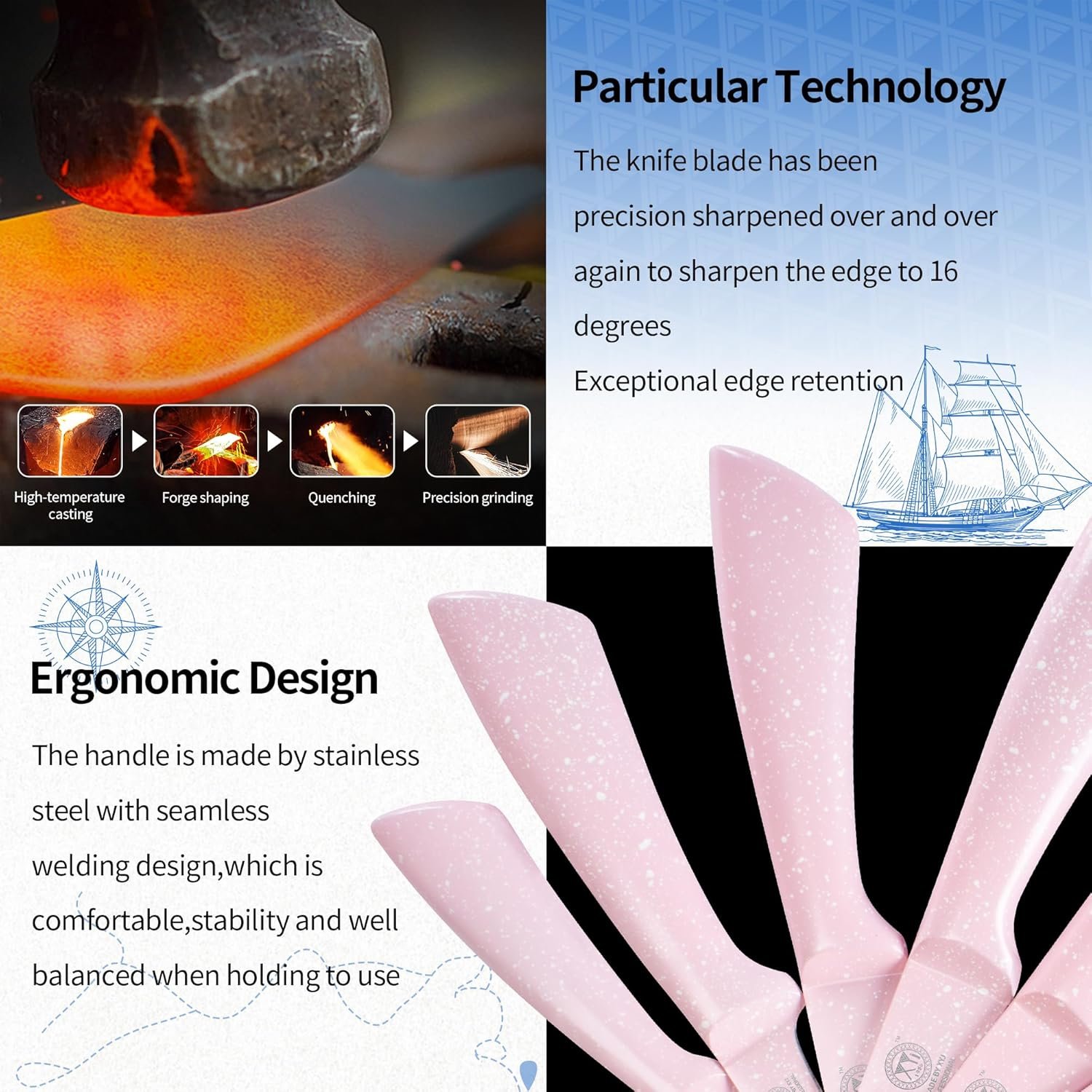 The blade of this kitchen knife is made of high-quality stainless steel, using a V-shaped and fine processing blade, which can maintain the sharpness of the chef knife for a long time with incredible robustness and quality. The handle is made by stainless steel with seamless welding design, which is comfortable, stable, and well-balanced when holding to use.