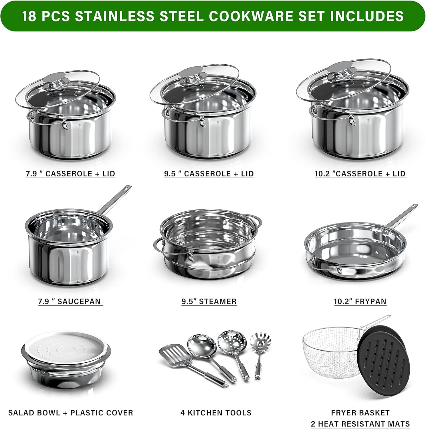 YSSOA 18-Piece Stainless Steel Kitchen Cookware Set, Including Saucepan, Casseroles with Tempered Glass Lid, Frypan, Steamer, Salad Bowl , Fryer Basket, Heat Resistant Mat & Utensils Set, Silver