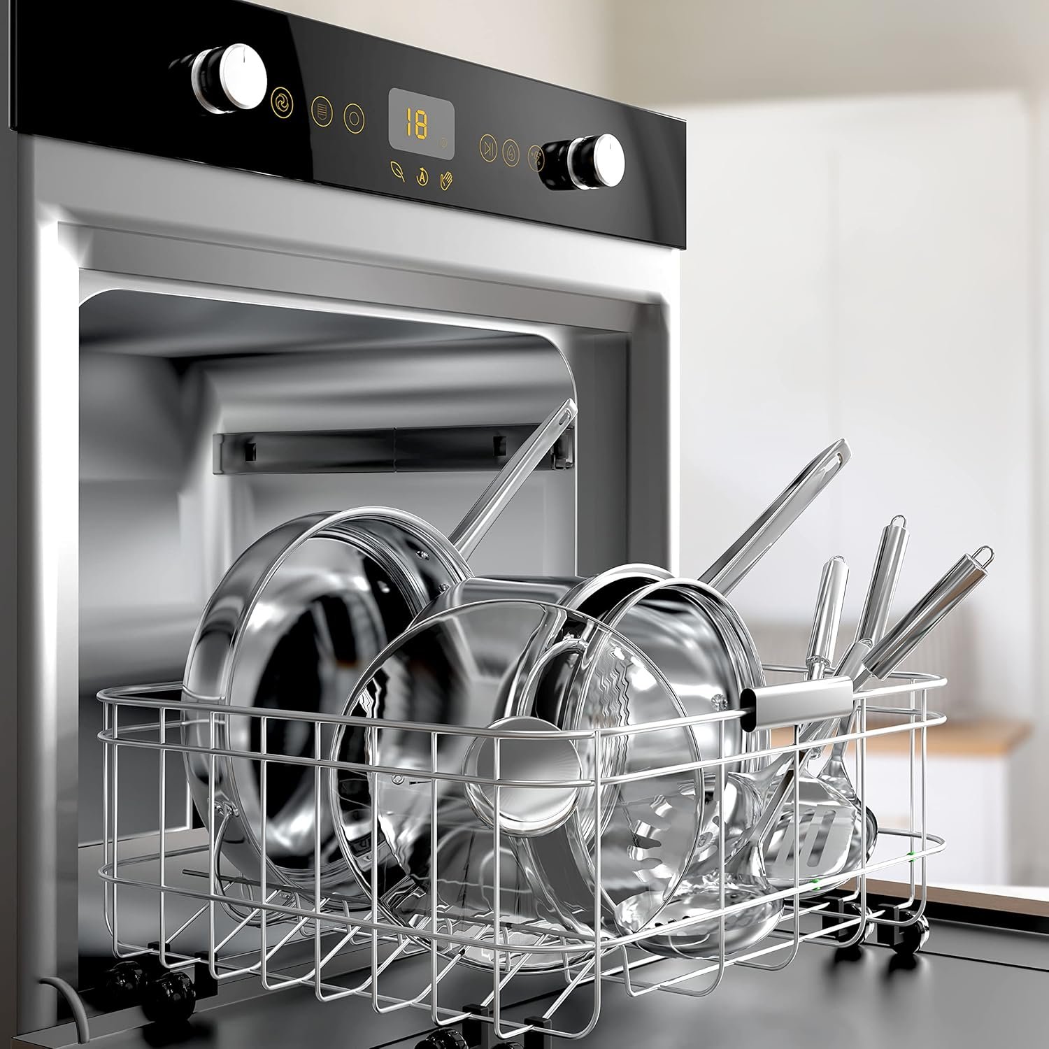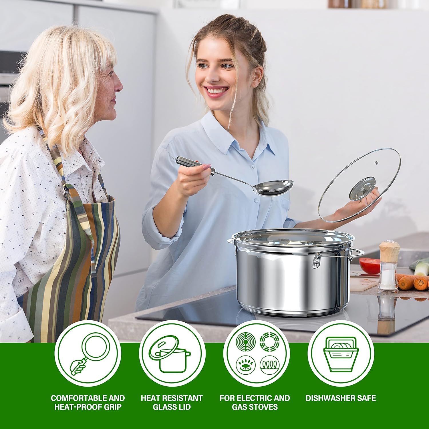 This classic mirror polished stainless-steel cookware set is designed to fit your current kitchen style and deliver cooking versatility. With its capsuled base, perfect heat distribution is ensured, allowing for even searing, browning, and sautéing. The set includes 4 pieces of utensils, bringing more convenience to your cooking experience. Long, comfortable handles and lid knobs keep you safe from being scalded, while the mirror polished cookware makes it easy to clean. Measurement markings give you the confidence to follow any recipe.