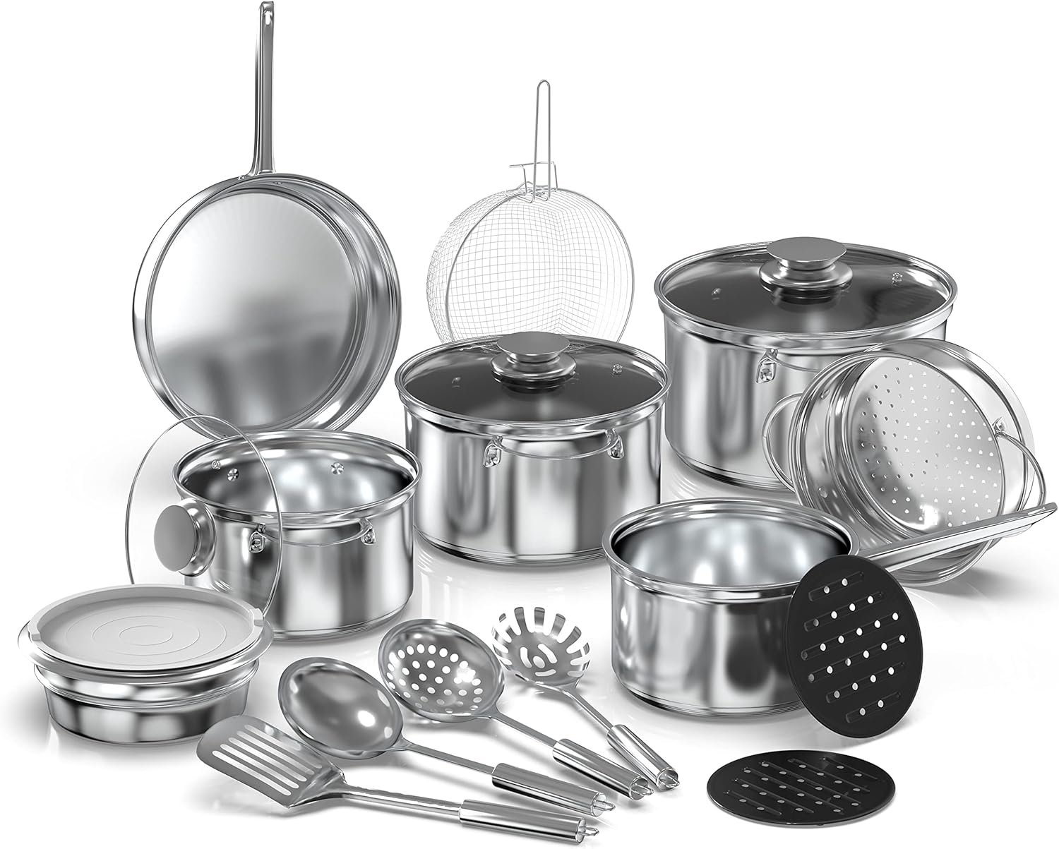 Home Kitchen Cookware Sets YSSOA 18-Piece Stainless Steel Kitchen Cookware Set, Including Saucepan, Casseroles with Tempered Glass Lid, Frypan, Steamer, Salad Bowl , Fryer Basket, Heat Resistant Mat & Utensils Set, Silver
