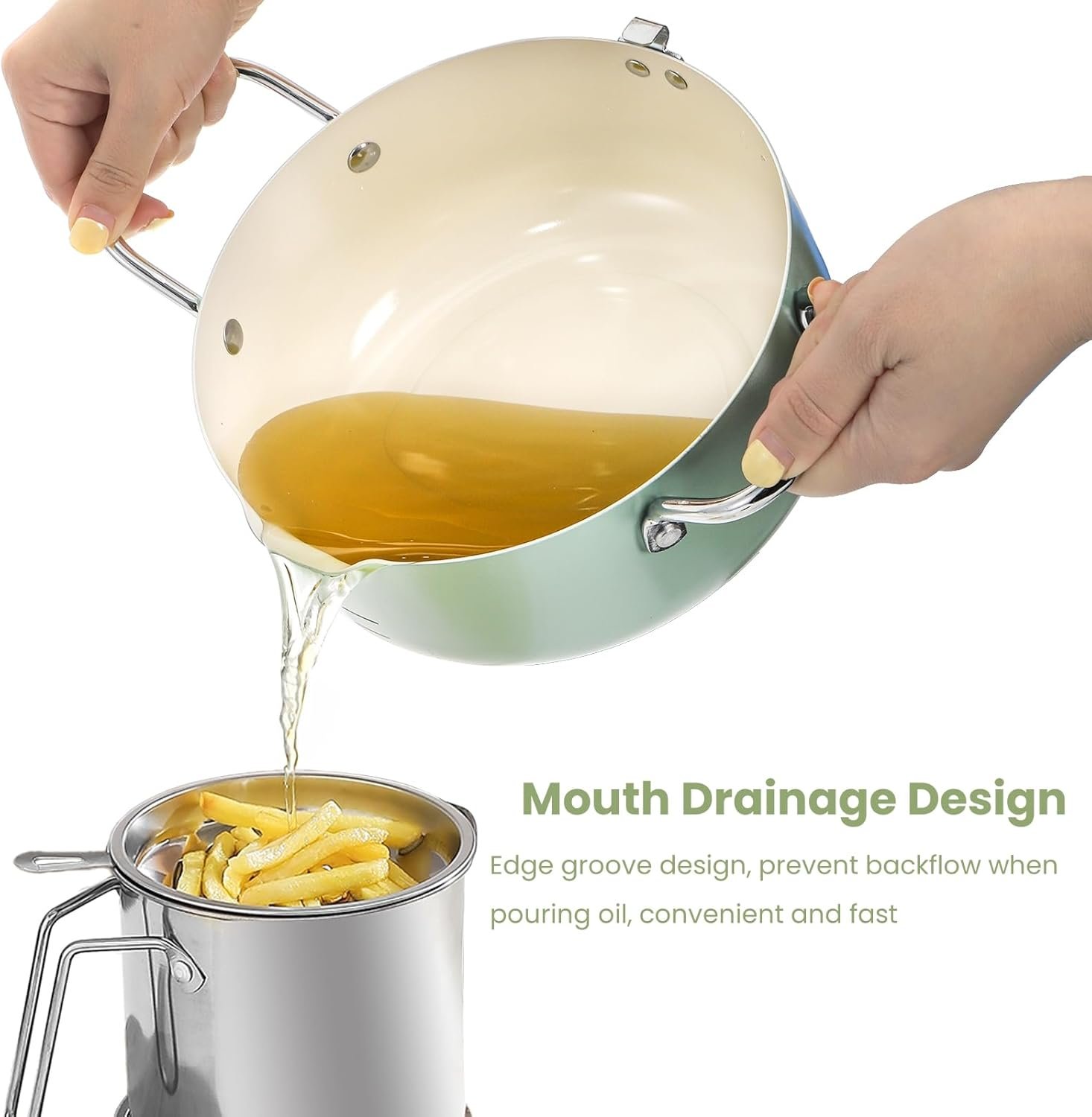 - Unique design: Features handles on each side for easy cooking and transferring of food, with a slight curve to prevent hot oil splatting and a lip to pour the oil.