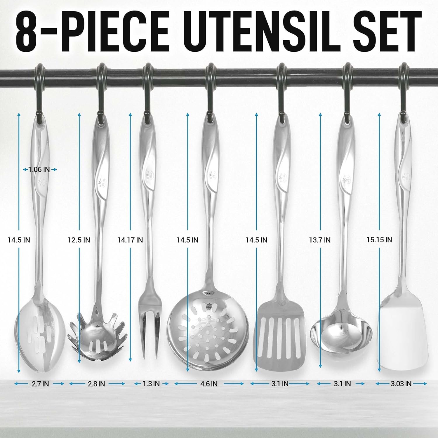 Elegant & Sleek Cooking Set: Considering an upgrade to your everyday cooking tools? Look no further, we got the right set of utensils for you. Introducing The Zulay Kitchen 8-Piece Cooking Set made from premium quality stainless steel that is durable, sturdy, and long-lasting. This set comes with a slotted spatula, spaghetti server, draining spoon, ladle, cooking fork, utensil crock, and non-slotted spatula.