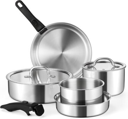 E-far 9pcs Stainless Steel Cookware Set, Tri-Ply Pots and Pans Set with Detachable Handle, Induction Cookware Kitchen Cooking Set for RV Camping, Nontoxic Whole Clad Frying/Saute/Sauce Pan, Oven Safe