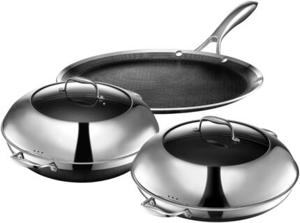 HexClad Hybrid Nonstick 5-Piece Cookware Set, 14″ Pan with Lid, 14″ Wok with Lid, and 12″ Griddle, Stay-Cool Handles, Dishwasher and Oven-Safe, Induction Ready, Compatible with All Cooktops