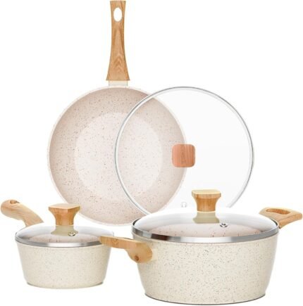 Innerwell Pots and Pans Set Nonstick, 6 Piece Nonstick Kitchen Cookware Sets with Bakelite Handles, White Granite Non-Toxic Non Stick Cooking Set, Induction Compatible(PFOS, PFOA Free)