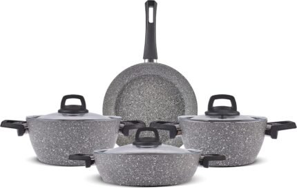 Karaca Gris BioGranite 7 Piece Granite Cookware Pot and Pan Set, Non-Stick Coating, Dishwasher-Safe & Induction Pot Set, Granite Pots and Pans, 3 Pots with 3 Glass Lids and 1 Frying Pan