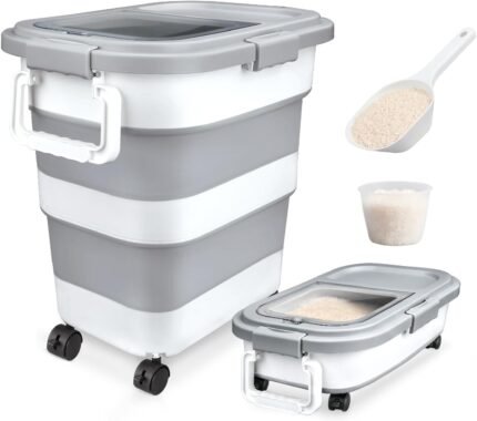 Rice Storage Container, Collapsible Airtight Food Storage Container 10-40 Lb, Rice Dispenser Bin with Cup and Scoop for Flour Cereal Pasta Grain, Cat Bird Pet Dog Food Storage Container 25lb