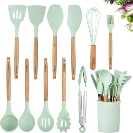 Silicone Cooking Utensil Kitchen Utensils Set, 12 Pieces Silicone Kitchen Utensil Wooden Handles, Kitchen Spatula Sets with Holder Spoon Turner Tongs,Mint Green