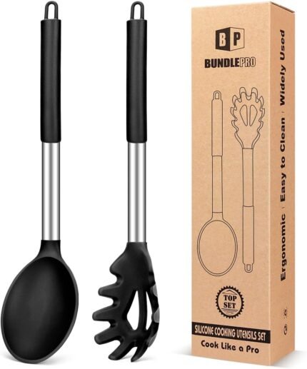 Silicone Pasta Fork and Cooking Spoon Set, Non Stick Kitchen Utensils for Cooking,Stirring,Serving Spaghetti, Soup, Sauce (BLACK)
