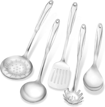 Stainless Steel Kitchen Utensils Set – 5 Piece Metal Cooking Utensils Set & Serving Utensils – Includes Spatula, Ladle, Spaghetti Server, Skimmer & Serving Spoon