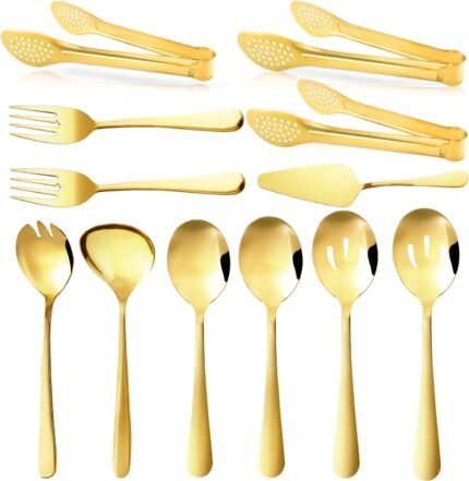 XEVOM Gold Serving Utensils Set, 12 Pack Polished Stainless Steel, Includes Spoons, Forks, Tongs, Ladle, Cake Server (Gold)