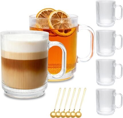 6 PACK Premium Glass Coffee Mugs with Handle, 12 OZ Classic Vertical Stripes Glass Coffee Cups, Transparent Tea Cup for Hot/Cold Beverages, Glassware Set for Americano, Latte, Cappuccino