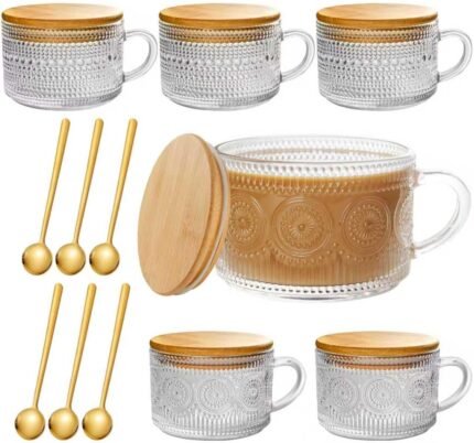 6 PACK Vintage Glass Coffee Mugs 14oz Clear Embossed Tea Cup Set with Bamboo Lids and Gold Spoons,Yogurt Bowl,kitchen gifts for women