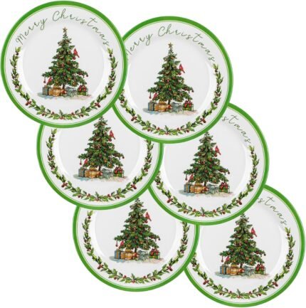 6 Pcs Christmas Melamine Plates Dinner Salad Plates Xmas Tree Dinnerware Xmas Wreath Dishes Holiday Tableware for Dessert Salad Appetizer Birthday Party(Christmas Tree,10 Inches)