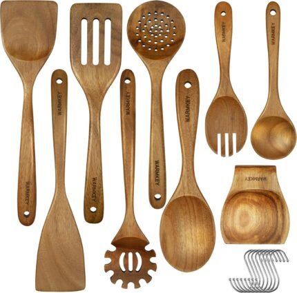 Acacia Wood Kitchen Utensil Set 9PC – Natural Wooden Cooking Tools for Nonstick Pans&Stir Frying, Scratch-Proof & Heat Resistant, Sturdy & Lightweight with Spoon Rest(Spatula/Spoon/Salad Fork)