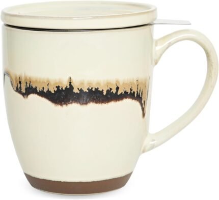 Bosmarlin Ceramic Tea Cup with Infuser and Lid, 16 Oz, Loose Leaf Tea Steeper Mug with Strainer, Microwave and Dishwasher Safe, Reactive Glaze (16 Oz, Beige)
