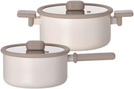 Chou Chou Kitchen Essential 4-Pieces Cookware Set with Lid, Healthy Cooking Ceramic Coating 8″ Pot, 7″ Saucepan, Induction Compatible Kitchenware, Made in Korea