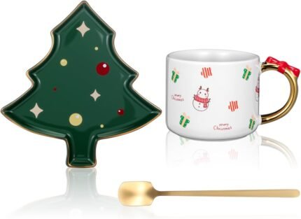 Christmas Mug With Tree Saucer: 3 PCS 8.12OZ Xmas Mug with Spoon – Festive Ceramic Tableware Range Present for Tea Coffee Cappuccino Espresso